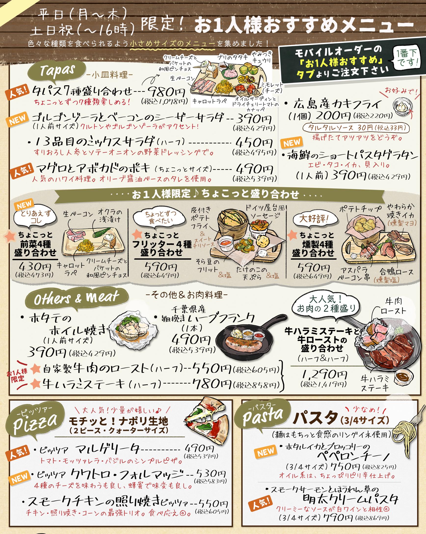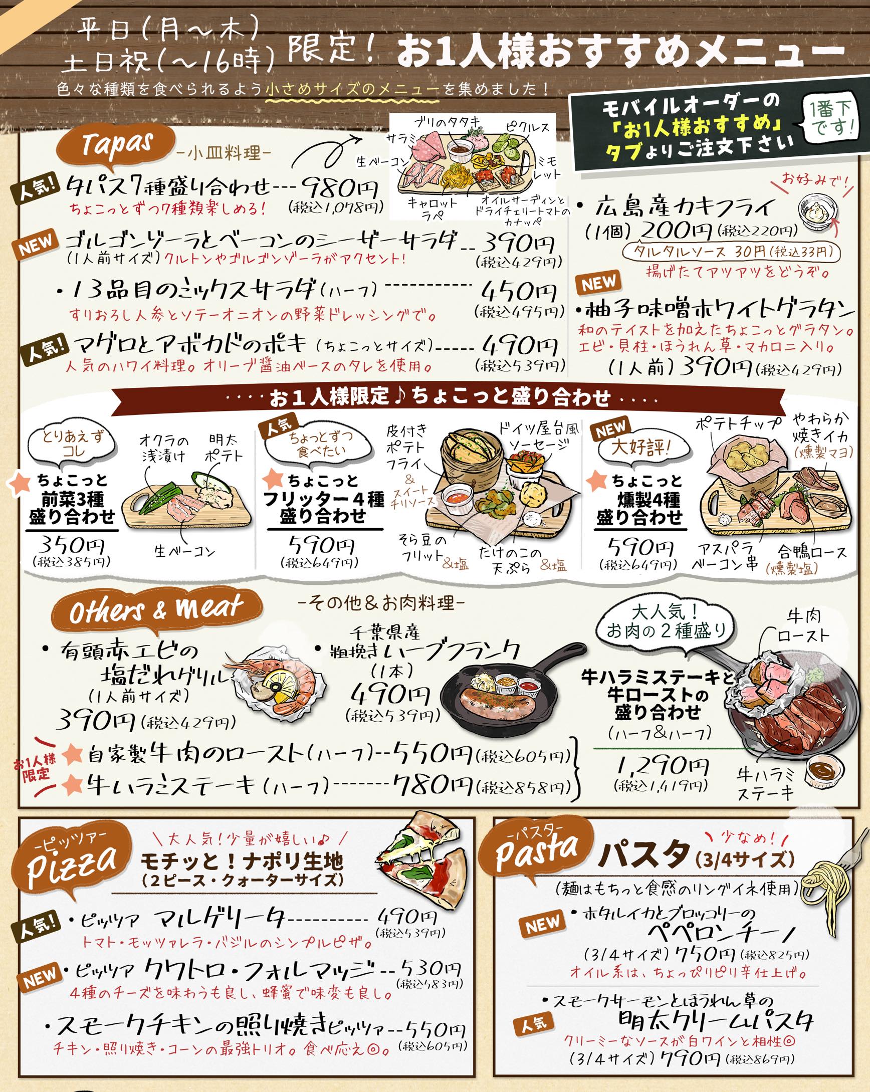 お仕事のあとや休日に、お1人様も気軽にお食事やお酒を楽しんでもらえるよう「お1人様限定メニュー」を作りました!